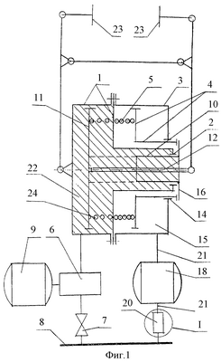 Тормозная магистраль 8 и упомянутая штоковая полость 15 сообщены между собой зарядно-разрядным каналом 21.