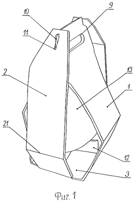 Изображенная на фиг.1 тара состоит из двух вытянутых в продольном направлении и симметричных относительно продольной оси пластинчатых заготовок 1 и 2, каждая из которых разбита на несколько составляющих ее участков, таких как донышко 3 и 4, боковые стенки 5 и 6 и краевые участки 7 и 8 (фиг.2, 3). Краевые участки 7 первой заготовки выполнены в виде прорезных ручек 9. По боковым сторонам каждой ручки образованы фиксирующие выступы 10. Краевые участки 8 второй заготовки имеют трапецеидальную форму, и на них в продольном направлении образованы прорези 11, предназначенные для взаимодействия с выступами 10 первой заготовки в собранном положении упаковки.