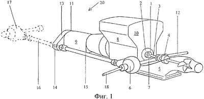 Хотя изобретение описано в связи с конкретными вариантами осуществления, которые в настоящее время считаются наиболее практичными и предпочтительными, понятно, что изобретение не сводится к описанным конструкциям, а должно рассматриваться как охватывающее различные модификации и эквивалентные конструкции, находящиеся в рамках объема притязаний изобретения. Например, не является существенным тот факт, что передачу движения между средством отбора мощности и судовым движительным агрегатом можно включать посредством разъединительного устройства. Кроме того, первый приводной вал 15 можно было бы расположить таким образом, чтобы он проходил бы ниже двигателя 8, а не вдоль одной его стороны.