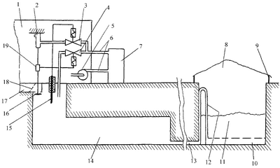 Реле уровня жидкого навоза 15, загрузочный клапан 16, навозный лоток 17, фильтр-сетка 18 и датчик 19 положения загрузочного клапана 16 установлены в свинарнике.