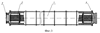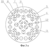 Устройство содержит кожух 1, в котором размещен излучатель 2, на одном из торцов кожуха расположен узел глухого заднего зеркала с котировочным механизмом 3, а на другом – выходное окно 4, трубки излучателя 5 скомпонованы (см. фиг.3,а) в несколько слоев один внутри другого и имеют внутренний диаметр 5-7 мм. Трубки наружного слоя в количестве 20 расположены по конфигурации неравностороннего восьмигранника, оси трубок 6 вписываются в поперечном сечении в окружность диаметром 63 мм. Размеры граней по осям крайних трубок 7, 8 равны соответственно 29 и 19 мм. В меньших гранях 8 имеется по одной трубке между крайними трубкам, а в больших гранях 7 – по две трубки между крайними трубками. Трубки второго слоя в количестве 8 расположены по конфигурации неравностороннего восьмигранника попарно. Оси трубок вписываются в окружность диаметром 44 мм. Размеры граней по осям крайних трубок 9, 10 равны соответственно 23,5 и 10 мм. Каждая пара трубок расположена напротив меньших граней 8 наружного слоя. Третий слой имеет конфигурацию равностороннего четырехгранника с количеством трубок, равным 4, оси которых вписываются в окружность диаметром 29 мм. Размеры граней 11 равны 20,5 мм. Внутренний пакет трубок расположен по конфигурации равностороннего четырехгранника с осями трубок, расположенными по окружности диаметром, например 14 мм, размерами граней 12, например 10 мм. Последний слой имеет четыре трубки, расположенные каждая напротив меньших граней наружного слоя.
