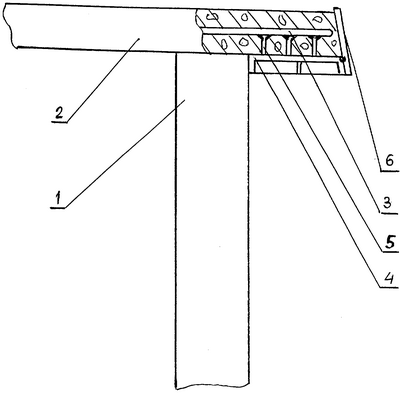 Как правило, больше всего разрушается край карнизной плиты 2, нависающий над стеной 1 здания. Дефектный участок плиты разрушают до монолитного бетона с обнажением арматуры 3. Дефектные участки арматуры при необходимости заменяют. После проведения указанных подготовительных работ нижний щит 4 заводят под плиту, прижимают его известным способом, например с помощью струбцин, к нижней поверхности плиты и через посредство ребер жесткости 5 соединяют (обычно путем сварки) в нескольких точках с элементами арматуры, после чего струбцины снимают. Затем вдоль продольной кромки щита 4 под углом к поверхности стены устанавливают и жестко (точечной сваркой) закрепляют дополнительный фасадный щит 6. Установка щита 6 под углом к поверхности стены обеспечивает, с одной стороны, его жесткость и устойчивость при укладке и уплотнении бетона, с другой стороны, формирует заданный наклон фасадной поверхности плиты. После установки и закрепления щитов, образующих опалубку, в последнюю укладывают с уплотнением бетонную смесь. После отверждения бетона точки приварки щита 6 любым известным способом разрушают, и щит снимают. Нижний щит 4 остается замоноличенным в плиту и служит в качестве дополнительного элемента ее усиления.