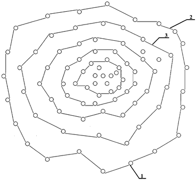 Предложенный способ поясняется чертежом, где 1 – нефтяные эксплуатационные скважины, 2 – внешний периметр расположения эксплуатационных скважин, 3 – первый внутренний периметр расположения эксплуатационных скважин. Способ осуществляется следующим образом. Сначала производят закладку взрывных зарядов в нефтяных эксплуатационных скважинах 1 по внешнему периметру 2 исчерпанного месторождения, одновременный их подрыв и выкачивание образовавшейся свободной нефти через эксплуатационные скважины 1, расположенные внутри внешнего периметра 2. Затем в скважинах, расположенных по первому внутреннему 3 по отношению к указанному внешнему 2 периметру, производят закладку и одновременный подрыв зарядов. Выкачивание нефти производят через эксплуатационные скважины внутри первого внутреннего периметра 3. В дальнейшем производят повторение этих операций до центра месторождения. Такая система закладки взрывчатых зарядов и одновременность взрывов создает вектор движения освободившейся нефти от периферии месторождения к центру, что позволит выкачать всю освободившуюся из пор нефть.
