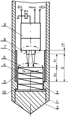 Расстояние между датчиком и зеркалом выбрано минимальным с соблюдением условия, что при максимальном сжатии пружины, равном верхнему значению шкалы измерения, это расстояние равно “мертвой зоне” приема S. 10 – ограничительный бурт для хода головки 2.