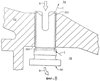 На противоположных сторонах удлиненной части 102 сформирована пара пазов 122. Пазы 122 начинаются на дальнем конце 112 удлиненной части 102 и проходят вниз по части длины удлиненной части 102. Пазы 122 разделяют удлиненную часть 102 на два зубца 124. Каждый из зубцов 124 имеет пару скошенных поверхностей 120, сформированных на его дальнем конце 112 на противоположных сторонах зубца 124. От дальнего конца 112 каждого из зубцов 124 отступает кольцевой выступ 126. Хотя показанный пример имеет два паза 122, следует отметить, что в удлиненной части 102 могли бы формироваться три или более пазов 122, разделяющих ее на три или более зубцов 124. Во внешней поверхности 128 удлиненной части 102 сформирован, по меньшей мере, один маслосборный канал 130. Как лучше видно на фиг.4 и 5, в показанном примере маслосборные каналы 130 выполнены в форме канавок, имеющих по существу полукруглое поперечное сечение, хотя могут использоваться другие конфигурации. Маслосборные каналы имеют выходы 132, расположенные на дальнем конце удлиненной части 102. Маслосборные каналы затем проходят в осевом направлении к фланцу 104. В точке, где маслосборные каналы 130 пересекаются с кольцевой канавкой 114, они сворачивают в углу 134 и проходят в радиальном направлении наружу, заканчиваясь входом 136, расположенным в фланце 104 и совмещенным с плоской поверхностью 108.