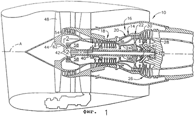 На чертежах, на которых одинаковые ссылочные номера обозначают одинаковые элементы в разных видах, фиг.1 изображает газотурбинный двигатель, обозначенный в целом номером 10, в конструкцию которого включена маслосборная пробка, показанная на фиг.3-8. Двигатель 10 имеет продольную центральную линию или ось А и наружный неподвижный кольцевой корпус 14, расположенный концентрически вокруг и соосно оси А. Двигатель 10 включает центральную часть 16 газогенератора, которая состоит из многоступенчатого компрессора 18, камеры 20 сгорания и либо одноступенчатой, либо многоступенчатой турбины 22 высокого давления, которые расположены соосно вокруг продольной оси или центральной линии А двигателя и последовательно по ходу осевого потока. Кольцевой наружный ведущий вал 24 жестко соединяет компрессор 18 и турбину 22 высокого давления.