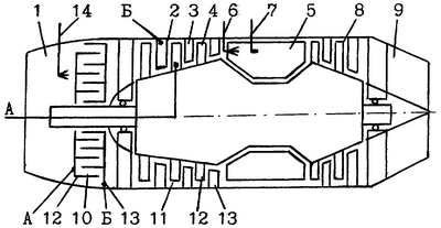 Перед пуском двигателя в работу на электроды 12 и 13 электролизеров 10 и 11, по линиям А и Б, от бортового источника /не показано/ подают постоянный ток. Затем пусковым устройством раскручивают ротор двигателя. Работой направляющих 3 и рабочих 4 лопаток осевого компрессора 2 атмосферный воздух через входное устройство 1 засасывается в двигатель. Поток воздуха, с естественным путем присутствующим в нем водяным паром и с дополнительно, например, форсункой 14 введенным в него и распыленным этой же форсункой электролитом, например, водным раствором едкого кали, вначале поступает на электролизер 10, где водяной пар за счет прохождения постоянного тока частично диссоциирует. Дальше воздушный поток поступает на электролизер 11, где сжимается работой направляющих 3 и рабочих 4 лопаток осевого компрессора 2, и в процессе сжатия, опять же за счет прохождения постоянного тока, пары воды окончательно диссоциируют. Обогащенный водородом и кислородом сжатый воздух затем поступает в камеру сгорания 5, куда также системой подачи топлива 6 подают топливо. Образующаяся обогащенная водородом и кислородом топливовоздушная смесь воспламеняется при помощи воспламенительного устройства 7. Далее продукты сгорания, совершая полезную работу, расширяются в турбине 8 и через выхлопное устройство 9 отводятся в атмосферу.