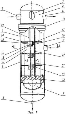 Поверхностный подогреватель работает следующим образом. Поток нагреваемой воды через патрубок 5 поступает в верхнюю распределительную водяную камеру 4. Перегородка 7 обеспечивает поступление нагреваемой воды в трубы первого хода трубной системы 10, где вода нагревается за счет конденсации пара и переохлаждения конденсата. После труб первого хода нагреваемая вода поступает в нижнюю поворотную водяную камеру 8, после которой проходит трубы второго хода трубной системы 10, нагревается за счет конденсации пара, и поступает в водяную камеру 4, и далее через патрубок 6 выводится из подогревателя. Греющий пар через патрубок 2 поступает в корпус 1, распределяется в нем по всей высоте трубной системы 10 и выходит между горизонтальными перегородками 14 на трубы поверхности теплообмена трубной системы 10, на которых конденсируется, передавая тепло конденсации пара нагреваемой воде, протекающей в трубах. После прохождения паром всех труб трубной системы 10 и повышения концентрации воздуха в нем образовавшаяся паровоздушная смесь через вертикальную перфорированную трубу отводится из подогревателя. Конденсат пара с труб поверхности теплообмена стекает на горизонтальные перегородки 13 и 14. С перегородки 14 конденсат поступает в короб 16. При стекании конденсата с труб поверхности теплообмена и движении его по перегородке 14 он переохлаждается. Дополнительное переохлаждение конденсата обеспечивается при его контакте с трубами поверхности теплообмена, расположенными в коробе 16, полностью заполняемом конденсатом, благодаря наличию гидрозатвора 20. Переохлаждение конденсата в коробе 16 происходит при прямоточном его движении в опускном клапане гидрозатвора 20 и противоточном в подъемном канале. Степень дополнительного переохлаждения конденсата можно регулировать величиной поверхности теплообмена труб, располагаемых в коробе 16. Переохлажденный при стекании с труб поверхности теплообмена и при движении в коробе 16 конденсат поступает в сквозной канал 22, далее по нему направляется на нижнюю трубную доску 12 и, сохраняя переохлаждение, выводится из подогревателя через патрубок 3.