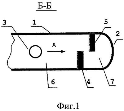 Устройство работает следующим образом. При взрыве взрывного устройства 3 ПВ распространяются вдоль оси цилиндрического корпуса 1 камеры. Поток ПВ, отразившись от элемента 5, тормозится и при этом возникает течение через промежуток из взрывного объема 6 в буферный 7. При этом течение ПВ приобретает вихревой характер. Вследствие падения давления в струе ПВ в промежутке происходит слияние элементов и промежуток между ними перекрывается; ПВ, затекшие в буферный объем, смягчают удар преграды по торцевой стенке 2 канала. В целом происходит растяжение во времени импульса взрывной нагрузки на торцевую стенку и вследствие этого снижение его амплитуды. Вместе с тем преграда играет роль не только фактора снижения амплитуды взрывной нагрузки на торцевую стенку, но, при необходимости, и защиты от осколков, а также пыли, аэрозолей и газообразных продуктов взрыва.