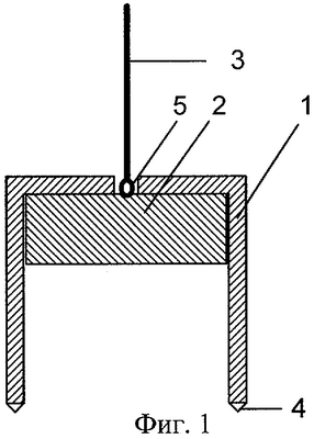 Чувствительный элемент на фиг.1 состоит из телескопического стакана, который имеет полую секцию 1 цилиндрической формы и секцию 2 в форме цилиндра. Секция 1 имеет отверстие для троса 3, который соединен с секцией 2. Диаметр секции 2 меньше внутреннего диаметра секции 1. Высота секции 2 меньше высоты секции 1, соответственно ее масса меньше массы секции 1. Нижний торец 4 периферийной секции 1 выполнен заостренным. Трос 3 закрепляется в центре верхнего торца секции 2 с помощью ушка 5.