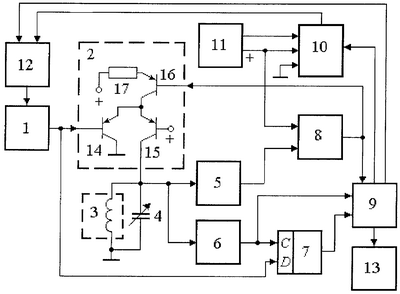 В схеме амплитудного детектора 5 можно использовать операционный усилитель, например, типа КР140УД12 с высокочастотным диодом КД503 и конденсатором, а в формирователе импульсов 6 – микросхему КР1554ТЛ1 “Триггер Шмитта”. D-триггер 7 реализуется на микросхеме КР1554ТМ2, дифференциальный усилитель 8 – на микросхеме КР140УД12, блок обработки информации 9 – на основе стандартного микропроцессора. Аналоговый коммутатор 10 может быть реализован на микросхеме К561КП1, источник опорного напряжения 11 – на микросхеме стабилизатора напряжения с резистивным делителем на выходе, интегратор 12 – на типовой схеме дифференциального усилителя с резистором на входе и конденсатором в цепи обратной связи. В качестве блока индикации 13 можно использовать жидкокристаллическое индикаторное табло, применяемое в цифровых калькуляторах.