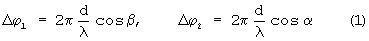 Разности фаз высокочастотных колебаний, принимаемых антеннами 1 и 2, 1 и 3, определяются соотношением (1). С другой стороны, указанные разности фаз определяются следующим образом: