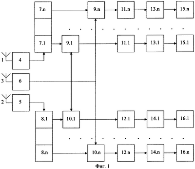 Сигналы нескольких источников радиоизлучений одновременно улавливаются приемными антеннами 1, 2, 3, усиливаются и ограничиваются по амплитуде в приемниках 4, 5, 6 соответственно. При этом приемные антенны 1, 2, 3 располагаются в виде геометрического прямого угла, в вершине которого помещается третья приемная антенна 3, общая для двух других приемных антенн 1 и 2, расположенных в угломестной и азимутальной плоскостях. Затем сигналы, принимаемые первым 4 и вторым 5 приемниками, пропускают через n-отводные линии задержки 7.i и 8i (i=1, 2,…,n) соответственно.