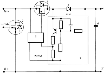Регулятор постоянного напряжения является регулятором параллельного типа и работает следующим образом. При подключении ко входным клеммам 1 и 1′ источника постоянного напряжения с полярностью, показанной на чертеже, конденсатор фильтра 6 и нагрузка, подключенные к выходным клеммам 2 и 2′, получают питание через последовательные диод МДП-транзистора 4 и диод Шоттки 5. Поскольку источник постоянного напряжения является источником ограниченной мощности, напряжение на конденсаторах фильтра будет плавно нарастать и при достижении номинального напряжения ШИМ-модулятор сформирует импульсы отпирания для МДП-транзистора 3, который, открываясь и закрываясь, будет поддерживать номинальное напряжение на нагрузке.