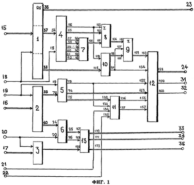 На фиг.1 показаны первый 15, второй 16 и третий 17 информационные входы системы, первый 18, второй 19 и третий 20 синхронизирующие входы системы, первый 21 и второй 22 управляющие входы системы, информационный 23 и адресный 24 выходы системы, первый 31 и второй 32 синхронизирующие выходы системы и группа информационных 33-35 выходов системы.