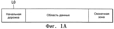 Диск с однократной записью, имеющий единственный слой L0 записи, показанный на фиг.1A, включает в себя начальную дорожку, область данных и оконечную зону, расположенные от внутренней окружности до внешней окружности. В качестве сравнения, каждый из первого слоя L0 записи и второго слоя L1 записи диска с однократной записью, имеющего два слоя записи, как показано на фиг.1B, включает в себя начальную дорожку во внутренней области 1 и внутренней области 2, область данных 1 и область данных 2 и оконечную зону во внешней области 1 и внешней области 2, расположенные от внутренней окружности до внешней окружности соответственно. Однако понятно, что могут быть использованы дополнительные слои записи, и любые такие слои записи могут быть с однократной записью, предназначенными только для считывания или перезаписываемыми и могут иметь изменяющиеся плотности записи.