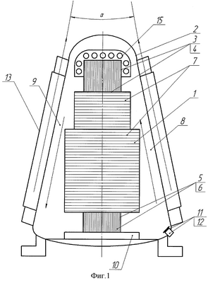 Подстанция работает следующим образом. При включении подстанции в электрическую сеть в обмотках 7 и магнитопроводе 3 начинает выделяться тепло. Выделяемое тепло нагревает воздух, находящийся внутри подстанции, происходит его расслоение на температурные зоны: вверху подстанции температура воздуха достигает температуры 150°С и выше. Для эффективной работы подстанции и недопущения взрыва необходимо перемешивание воздуха, что выравнивает температуру внутри подстанции. Перемешивание воздуха осуществляется посредством трех вентиляторов 11, которые включаются через приводы 12 и установлены в нижней части оболочки 2 подстанции у нижнего ярма 5 напротив силовых обмоток 7. Потоки воздуха от вентиляторов 11, соприкасаясь с направляющими пластинами 10, направляются внутрь обмоток 7 вдоль вертикальных стержней 6 магнитопровода 3. Горячий воздух, находящийся в верхней части подстанции, будет опускаться по продольным каналам 8 и 9 вдоль боковых стенок оболочки 2, которые представляют собой панели 13, выполненные из тонкостенных труб, по которым пропускается охлаждающая жидкость, поступающая из радиатора 14 охлаждения жидкости. Через циркуляционный насос 16 охлаждающая жидкость поступает в коллектор 15 охлаждения верхнего ярма 4. Нагретая жидкость из тонкостенных труб панелей 13 и коллектора 15 охлаждения верхнего ярма 4 подается в радиатор 14 охлаждения охлаждающей жидкости, который имеет принудительную систему охлаждения (не показана).