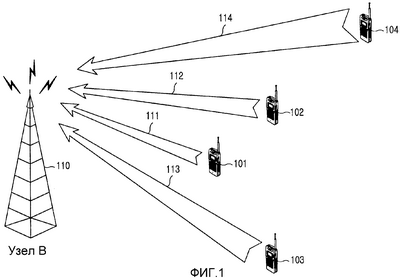 Фиг.1 иллюстрирует передачу данных по обратной линии связи по (каналу) E-DCH в типовой системе мобильной связи. Ссылочная позиция 110 обозначает Узел B, поддерживающий E-DCH, и ссылочные позиции 101-104 обозначают UE, использующие E-DCH. Как проиллюстрировано, UE 101-104 передают данные к Узлу B 110 по каналам E-DCH 111-114.