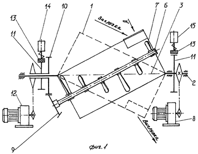 Смеситель состоит из контейнера 1, выполненного в виде цилиндрической емкости и способный вращаться на цапфах 2 в течение фазы смешения вокруг оси 3, расположенной под углом относительно геометрической оси контейнера и пересекающей его торцы в краевых и диаметрально противоположных точках, горловину 4 для загрузки и выгрузки кормосмеси, герметически закрываемую крышкой 5. Внутри контейнера 1 на валу 6 находятся лопасти 7, которые выполнены с возможностью вращения с валом 6 относительно геометрической оси контейнера 1. Привод осуществляется от мотор-редуктора 8 посредством планетарного механизма, водилом которого является контейнер 1, а сателлитом – вал 6 с лопастями 7 и жестко закрепленным на нем с внешней стороны контейнера 1 коническим зубчатым колесом 9, находящимся в зацеплении с неподвижным при смешении центральным зубчатым колесом 10, выполненным заодно с тормозным барабаном 11. При выгрузке готовых кормосмесей центральное зубчатое колесо 10 и тормозной барабан 11, расположенные на одной из цапф 2, подвижны, так как снабжены автономным приводом 12 и нормально замкнутым тормозом 13 с управлением от электромагнита 14, сблокированного электрической цепью с электродвигателем привода 8 контейнера 1. Аналогичный тормоз 15 имеется и для удержания контейнера при разгрузке горловиной вниз. Лопасти 7 внутри контейнера 1 расположены по винтовой линии с углом атаки в сторону горловины 4. Сама горловина 4 расположена на образующей контейнера 1 у его торца для удобства как загрузки компонентов, так и выгрузки готовой кормосмеси.