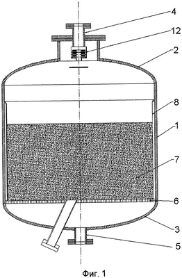 На Фиг.1 показан в разрезе реактор для проведения гетерогенных каталитических реакций, в частности реакций селективных превращений углеводородов. На Фиг.2 в увеличенном масштабе изображен фрагмент реактора, включающий слой катализатора, внешнюю и внутреннюю стенки реактора. На Фиг.3 показано распределительное устройство, установленное на входном штуцере.