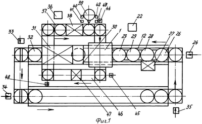Транспортером 46 камера 3 подается на устройство выбивки 47, а далее – устройством 48 на транспортер 37 для нанесения новой облицовки 4 на пескодувной машине 36, сушки ее, нагрева под заливку в проходной печи 38 и далее к месту заливки устройством 39.