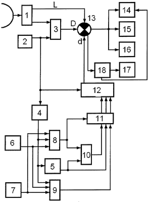 Управление дальнейшим процессом снижения скорости транспортного средства выполняется аналогично описанному до момента появления внезапно возникшего препятствия. В случае если расстояние до препятствия меньше минимально возможного тормозного пути, блок 13 сравнения выдает команду на блок 18 определения угла поворота управляемых колес. Блок 18 определяет оптимальный для возникших условий угол поворота управляемых колес и выдает управляющий сигнал на включение органов рулевого управления 17 и на блок 14 индикации.