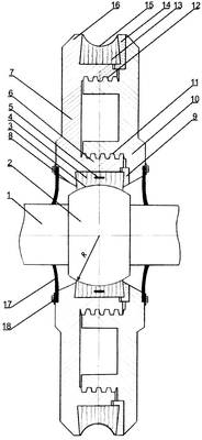 Втулка из ДМ 4 вставлена с натягом (запрессована) в малое опорное кольцо 6 базового диска 7 и нормированным усилием зажата с двух сторон в направлении прессования и возможного набухания между малыми щеками 8 базового диска 7 и малой шайбой 9 с помощью массивной дисково-кольцевой гайки 10. Втулка из ДМ 4 в поперечном сечении имеет форму ласточкиного хвоста, образуемого малой щекой диска 8 и малой шайбой 9, надежно удерживается и прижимается к малому опорному кольцу 6 базового диска 7.