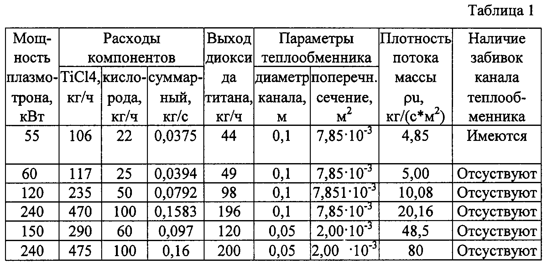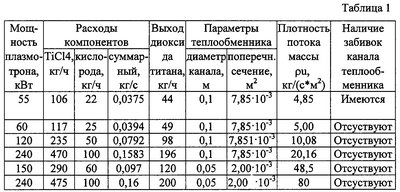 При этом в способе синтеза диоксида титана, включающем генерацию плазмы кислорода или кислородсодержащего газа, введение в плазменный поток тетрахлорида титана и разложение последнего в плазме, последовательное охлаждение образовавшихся продуктов реакции в закалочной камере и в теплообменнике и отделение целевого продукта – диоксида титана из пылегазового потока, согласно изобретению, охлаждение продуктов реакции после закалочной камеры осуществляют при течении пылегазового потока в однотрубчатом теплообменнике типа “труба в трубе” с массовой скоростью – плотностью потока массы от 5 до 80 кг/м2с.