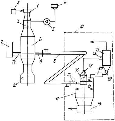 В плазмотроне 1 генерируют плазму кислорода (или кислородсодержащего газа), подаваемого из источника 2. Струя кислородной плазмы из плазмотрона 1 поступает в плазмохимический реактор 3, в который из расходной емкости 4 средством 5 подают тетрахлорид титана. В плазмохимическом реакторе 3 при взаимодействии тетрахлорида титана с плазмой кислорода протекают процессы реакции-синтеза диоксида титана. Продукты реакции представляют собой газовзвесь частиц диоксида титана размером 0,2÷1,0 мкм в хлор-газе, состоящем из хлора и избыточного кислорода. Пылегазовый поток продуктов реакции из реактора 3 поступает в закалочную камеру 6, где происходит их частичное охлаждение и осаждение крупной фракции диоксида титана, которая накапливается в бункере 21 крупной фракции, присоединенном к коническому днищу цилиндрического корпуса закалочной камеры 6, и затем направляется на переработку. Пылегазовый поток продуктов реакции из закалочной камеры 6 через радиальный выходной патрубок 9 направляют в теплообменник 8, в котором при течении с массовой скоростью – плотностью потока массы от 5 до 80 кг/м2с производят их окончательное охлаждение. Из теплообменника 8 пылегазовый поток через тангенциальный входной патрубок 12 поступает в верхнюю часть цилиндрического корпуса циклона 11, где под действием центробежных сил происходит осаждение диоксида титана из пылегазового потока в коническое днище. Закрученный пылегазовый поток из корпуса циклона 11 поступает в успокоительную камеру 15, у стенки которой тангенциальная скорость потока значительно выше тангенциальной скорости у стенки корпуса, что обеспечивает более полное осаждение мелких частиц диоксида титана. Хлор-газ с остаточным диоксидом титана из успокоительной камеры 15 по отводной трубе 17 подают во входной патрубок 18 запыленного газа рукавного фильтра 13, где происходит очистка хлор-газа от остаточного диоксида титана. Хлор-газ из рукавного фильтра 13 поступает к потребителю, а уловленный диоксид титана из выходного патрубка 19 уловленных частиц по транспортной магистрали 20 (винтовым конвейером) направляют в периферийную зону верхней части цилиндрического корпуса циклона 11. Осажденные в коническом днище циклона 11 мелких частиц диоксида титана пневмотранспортным средством 16 передают на дальнейшую переработку.