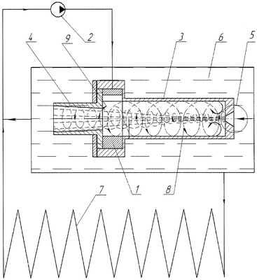 Термогенератор помещен в бак-накопитель 6 с водой. Через выходное отверстие и нагрузку 7 полость бака 6 соединена с входом насоса 2, а также, минуя нагрузку 7, соединена с всасывающей линией насоса 2. Рабочий объем 8 корпуса 3 ограничен цилиндрической поверхностью, его дном и кольцевым тормозным элементом 9 с левой стороны на части выходного сопла 4, примыкающего к циклону 1 и образованного за счет разности диаметров цилиндрической камеры и входного отверстия выходного сопла 4.