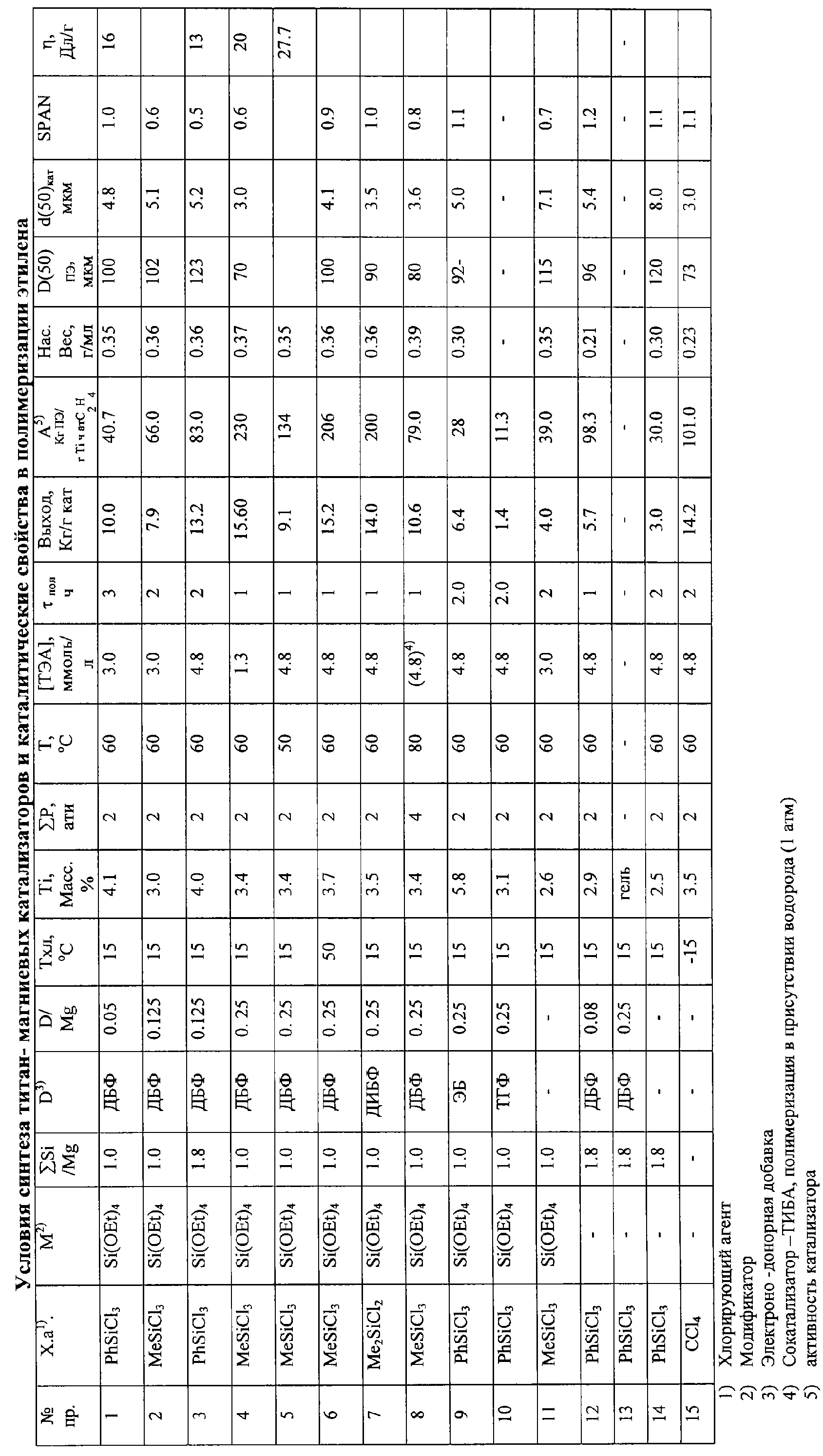 Изобретение относится к способу получения нанесенного титанмагниевого катализатора для производства полиэтилена (ПЭ) и сверхвысокомолекулярного полиэтилена (СВМПЭ) методом суспензионной полимеризации этилена в углеводородном растворителе. Известен ряд критериев для подбора катализаторов для производства СВМПЭ суспензионным методом: (1) Нанесенные титанмагниевые катализаторы как наиболее эффективные для производства ПЭ и СВМПЭ суспензионным методом. (2) Высокая активность при температурах полимеризации ниже 70°С, при которых можно получать СВМПЭ с молекулярной массой более 1·106 (характеристическая вязкость более 10 дл/г). (3) Размер частиц катализатора не более 7 мкм для получения порошка СВМПЭ с размером частиц не более 200 мкм. При этом для ряда марок СВМПЭ предпочтительно получать порошок СВМПЭ с размером частиц не более 100 мкм, для чего требуется использовать катализатор с размером частиц не более 4 мкм. (4) Узкое распределение частиц по размеру (отсутствие крупных частиц полимера размером более 300 мкм) и достаточно высокая насыпная плотность порошка полимера (более 350 г/л) и высокая сыпучесть порошка полимера. Известен способ приготовления нанесенного титанмагниевого катализатора, содержащего тетрахлорид титана на магнийсодержащем носителе, который получают взаимодействием раствора магнийорганического соединения (МОС) состава MgPh2·nMgCl2·mR2О, где Ph=фенил, R2O=простой эфир с R=бутил или i-амил, n=0.37-0.7, m=1-2, с четыреххлористым углеродом с последующей обработкой полученного магнийсодержащего носителя тетрахлоридом титана [РФ 2064836, B 01 J 31/38, 10.08.96]. Этот метод позволяет получать катализатор с регулируемым размером частиц в области от 30 до 3 мкм. Однако для получения катализатора с размером частиц в области 7-3 мкм, требуемым для производства СВМПЭ, взаимодействие МОС с CCl4 необходимо проводить при низких температурах (от -5°С до -15°С); при этом процесс взаимодействия МОС с ССЦ становится труднорегулируемым, особенно при увеличении объемов аппаратуры и количества получаемого катализатора. Известен способ приготовления нанесенного титанмагниевого катализатора, содержащего тетрахлорид титана на магнийсодержащем носителе, который получают взаимодействием раствора магнийорганического соединения (МОС) состава MgPh2·nMgCl2·mR2О, где Ph=фенил, R2О=простой эфир с R=бутил или i-амил, n=0.37-0.7, m=1-2, с Si(OEt)4 [РФ 2152404, C 08 F 4/64, 10.07.2000] с последующей обработкой носителя электронодонорным соединением и четыреххлористым титаном. Однако этот метод позволяет получать катализаторы с размером частиц только более 10 мкм. Наиболее близким является способ приготовления нанесенного титанмагниевого катализатора [РФ 2257263, B 01 J 31/38, 27.07.05], в котором магнийсодержащий носитель получают взаимодействием раствора магнийорганического соединения (МОС) состава MgPh2·nMgCl2·mR2O (где Ph=фенил, R2O=простой эфир с R=бутил или i-амил, n=0.37-0.7, m=1-2) с алкихлорсиланом RxSiCl4-x (R=алкил, фенил, х=1,2). Однако этот способ не позволяет получать катализатор с размером частиц менее 6 мкм. Кроме того, активность этого катализатора при температурах полимеризации В заявляемом изобретении ставится задача: найти способ синтеза нанесенных титанмагниевых катализаторов с высоким уровнем активности при низких температурах полимеризации ( Эта задача решается тем, что нанесенный титанмагниевый катализатор, содержащи