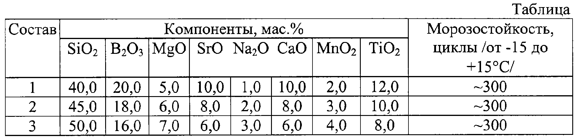 Изобретение относится к технологии силикатов, а именно к составам глазурей, которые могут быть использованы для покрытия изделий и фарфора, фаянса, майолики и другой керамики. Известна глазурь, содержащая SiO2, B2O3, MgO, SrO, Na2 Известна глазурь следующего состава, мас.%: SiO2 46,4-51,1, B2О3 24,2-28,6; MgO 4,8-6,7; SrO 2,0-3,5; Na2O 5,0-7,2; Al2O3 1,0-1,6; CaO 6,9-11,0 [2]. Морозостойкость такой глазури составляет около 100 циклов попеременного замораживания и оттаивания /от -15 до +15°С/. Целью изобретения является повышение морозостойкости глазури. Цель достигается тем, что в состав глазури дополнительно вводят MnO2 и TiO2, при следующем соотношений компонентов, мас.%: SiO2 40,0-50,0; B2O3 16,0-20,0, MgO 5,0-7,0; SrO 6,0-10,0; Na2O 1,0-3,0; CaO 6,0-10,0; MnO2 2,0-4,0; TiO2 8,0-12,0. В таблице приведены составы глазури. Компоненты глазури сплавляют при 1300°С с последующей грануляцией в воду. Фритту размалывают мокрым способом с добавкой 2-8% глины. Полученную суспензию перемешивают, наносят на керамические изделия и обжигают при 1000°С. Источники информации 1. Авторское свидетельство СССР №700479, С03С 9/00, 1979. 2. Авторское свидетельство СССР №948924, С03С 9/00, 1982.