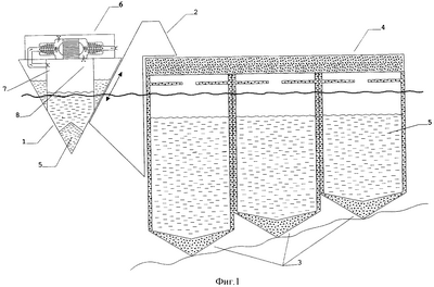 Конструкция гидрокомплекса представлена фиг.1, где 1 – шарнирный дебаркадер, 2 – направляющая аппарель, 3 – опорный сотовый бон, 4 – монолитная железобетонная плита, 5 – водный балласт, 6 – генератор, 7 – выпускной клапан, 8 – впускной клапан.