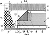 Цикл начинается (фиг.3) выпуском отбитой руды 10 под породной консолью 11 с минимальным разубоживанием, в результате чего образуется выпускная воронка 12. Над ней производят бурение скважин 13, принудительное обрушение вмещающих пород 2 из вентиляционно-буровых выработок 4 слоями 14, толщину которых выбирают из условия t2=(0,95÷0,97)С=2,8 м, где С – величина технически регламентируемого выхода ковша погрузочной машины за пределы защитного рудного козырька 9 (С=3 м для погрузочной машины ПД-8). Ввиду производства буровзрывных работ по обрушению слоя 14 вмещающих пород 2, отрезке блока 15 потолочины вмещающих пород 2 в очистном пространстве 16 из вентиляционно-буровой выработки 4, проводимой в еще не подработанном массиве рудной залежи 1, повышается безопасность труда. Высоту ho=3М/2Крп,=3·40/2·1,34 46 м параболического свода 17 над камерой 6 определим из условия заполнения воронки обрушения 12 (фиг.4) слоем обрушенных пород 18 с коэффициентом разрыхления Крп=1,34 (фиг.5). После отбойки слоя 19 (фиг.5) толщиной t2=2,8 м рудного козырька 9 на высоту hк=7 м и цикл повторяется.