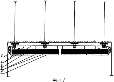 Монтаж водяного заслона осуществляется в обычном порядке: подвешиваются сосуды 2 под кровлей выработки и через отверстия 3 заполняются водой. К свободному концу 7 защитной ленты 6 каждого сосуда 2 прикрепляется груз 8 и размещается под кровлей выработки, например, на подвеске 9 (фиг.1).