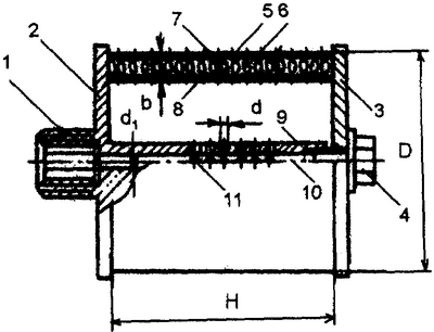 1. Глушитель шума, содержащий впускной патрубок и жестко связанный с ним корпус, содержащий шумопоглощающий элемент, отличающийся тем, что корпус содержит патрубок, выполненный в виде одной из боковых крышек корпуса, перпендикулярно к которой жестко прикреплена внутренняя цилиндрическая втулка, соосная с периферийно расположенными перфорированными втулками, причем другой конец внутренней цилиндрической втулки жестко соединен со второй боковой крышкой корпуса посредством винта, взаимодействующего с резьбовой частью втулки, причем во внутренней втулке выполнены калиброванные отверстия диаметром d, оси которых перпендикулярны оси втулки, а полость, образованная перфорированными втулками, заполнена шумопоглощающим элементом, причем отношение длины Н внешней периферийно расположенной перфорированной втулки к ее диаметру D находится в диапазоне оптимальных величин H/D=1,0…2,5, а отношение диаметра d калиброванных отверстий к внутреннему диаметру d1 внутренней втулки находится в диапазоне оптимальных величин d/d1=0,3…0,9, а отношение толщины b шумопоглощающего элемента к длине Н периферийно расположенных перфорированных втулок находится в диапазоне оптимальных величин b/Н=0,05…0,25.