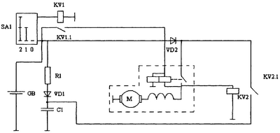 Система работает следующим образом. Заряд конденсатора С1 осуществляется от аккумуляторной батареи GB через зарядную цепь емкостного накопителя энергии – резистор R1 и диод VD1. При переводе включателя приборов и стартера SA1 во второе нефиксированное положение срабатывает реле включения стартера KV1 и подается напряжение на стартер. Привод стартера механизмом включения вводится в зацепление без ударных нагрузок с венцом маховика (на схеме не показано). С включением стартера происходит подача напряжения на реле включения емкостного накопителя KV2 и через замкнувшиеся контакты KV2.1 происходит разряд конденсатора С1 через включенный стартер, что приводит к увеличению крутящих моментов на валу якоря и повышает частоту вращения коленчатого вала двигателя при пуске.