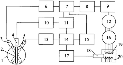 Схема содержит индукционный датчик 1 с магнитным двухполюсным ротором 2, соединенным механически с коленчатым валом двигателя и имеющим однозначные угловые положения, соответствующие угловым положениям коленчатого вала и положениям поршня в цилиндре двигателя. На статоре датчика расположены три индукционные обмотки 3-5. Положение обмотки 4 соответствует точке максимального сжатия (верхней мертвой точке, далее ВМТ); положение обмотки 3 соответствует среднему значению угла опережения зажигания в автомобилях (8-10 град угловых до ВМТ); положение обмотки 5 соответствует углу максимальной отдачи мощности (8-12 град угловых после ВМТ). Выходы обмоток 3-5 соединены с формирователями импульсов соответственно 6, 10, 13. Выходы трех обмоток датчика образуют три аппаратных канала импульсов с разными фазовыми углами. Первый канал импульсов зажигания содержит последовательно соединенные формирователь импульсов 6, генератор импульсов 7 с фазосдвигающим устройством, с рабочим и управляющим входами, усилитель-формирователь 8, прерыватель тока 9, трансформатор зажигания 12, распределитель высокого напряжения 16, свечи зажигания 19, расположенные в цилиндрах двигателя 20. Второй канал в цепи обмотки 5 содержит последовательно соединенные формирователь импульсов 13, компаратор 14, фазоамплитудный преобразователь 15, выход которого соединен с управляющим входом генератора 7. Третий канал в цепи обмотки 4 содержит формирователь импульсов 10 и синхронизатор 11, соединенный с синхровходами генератора 7 и компаратора 14. В первом цилиндре двигателя 20 установлен датчик давления 18, вход которого соединен с входом сравнения компаратора 14.