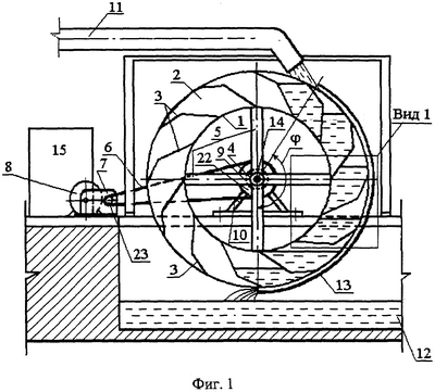 Водяное колесо посредством ступицы 4 и подшипниковых узлов 9 установлено на оси 14, закрепленной на опорах 10. Использование оси 14 облегчает и упрощает конструкцию предлагаемого устройства.