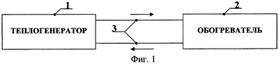Изображенная на фиг.1 общая схема устройства включает теплогенератор 1, нагревательный блок 2 и оборотную систему циркуляции жидкого теплоносителя 3.