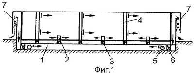 Тоннель достаточно большого сечения является фактически коллектором-камерой с практически одинаковым по всей его длине давлением, благодаря чему по подпольным каналам 3 равного аэродинамического сопротивления пройдут равные количества воздуха. Воздухораздающие тумбочки 2 могут иметь регуляторы расхода проходящего воздуха или дополнительные вспомогательные вентиляторы для перераспределения притока по участкам рабочей зоны.