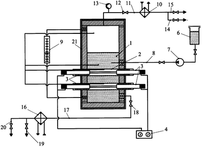 По истечении времени эксперимента отключают напряжение на электронагревательных элементах 3 и прекращают подачу рабочей жидкости в испарительную камеру 1. По окончании кипения (температуру в испарительной камере 1 снижают за счет снижения давления путем открытия клапана 12) и прекращении поступления пара в холодильник 10 отключают подачу охлаждающей воды. Полностью опорожняют испарительную камеру 1 через магистраль слива рассола 17.