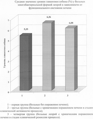 Более того, даже при клинической ремиссии хронического патологического процесса со стороны печени (3-я группа), несмотря на наблюдаемое относительное снижение уровня гликогемоглобина (6,08±0,18%), его среднее значение достоверно (р<0,01) превышало аналогичный показатель у больных 1-й группы. Это свидетельствовало о сохраняющихся у больных многобактериальной формой лепры определенных гепатогенных нарушений метаболизма углеводов даже в период относительно благополучной стадии течения хронического поражения печени, которая не сопровождалась какими-либо клиническими проявлениями.