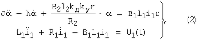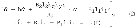 где J [кг·м2] – приведенный момент инерции; h [кг·м2/с] – приведенный коэффициент демпфирования; В1 [Тл], l1 [м], R1 [Ом], L1 [Гн] – индукция в зазоре, длина провода, сопротивление и индуктивность обмотки катушки 4; i1 [A], U1(t) [B] – ток в обмотке катушки 4 и приложенное к ней напряжение.