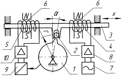 Схема предлагаемого стенда показана на чертеже, где 1 – платформа для установки испытуемого объекта, 2 – шарнир, 3 – якорь, 4, 5 – катушки, жестко закрепленные на якоре, 6 – магнитная система, 7 – задающий генератор, 8 – усилитель, 9 – датчик угла поворота, 10 – усилитель.