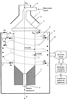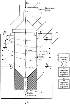На чертеже показана схема реализации предложенного СВЧ метода определения диэлектрической проницаемости и наблюдения процесса осаждения диэлектрических частиц. Схема состоит из конической рупорной антенны 1, круглого диэлектрического трубопровода 2, дозатора 3, устройства ввода-вывода жидкости 4, спирали приемных вибраторов В1…BN, расположенных на расстоянии d1 от поверхности трубопровода 5, спирали приемных вибраторов В1’…BN’, расположенных на расстоянии d2 от поверхности трубопровода 6, устройства согласования 7, адресной шины 8, мультиплексора 9, микропроцессорного устройства 10 и устройства вывода информации 11.