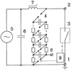 В качестве источника 4 высокого импульсного напряжения может быть использован генератор импульсных напряжений (ГИН), выполненный по схеме умножения, по каскадной схеме или по схеме Фитча. В качестве источника 5 тока могут быть использованы ударный генератор, мощная сеть или колебательный контур, подключаемые непосредственно или через трансформатор. Источник 5 тока зашунтирован конденсатором 6, емкость которого значительно больше емкости ГИНа в ударе. Конденсатор 6 совместно с реактором 7 служат для защиты источника тока от воздействия высокого импульсного напряжения при срабатывании ГИНа. При этом реактор 7 обеспечивает требуемую длительность импульса, необходимую для пробоя испытуемого выключателя и подключения его к источнику тока. Для снижения влияния реактора 7 на величину тока включения и уменьшения мощности ГИНа реактор может быть выполнен с нелинейной индуктивностью (например на феррите), входящей в насыщение после начала протекания тока включения.