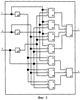 Как видно из фиг.3, блок логики 25 состоит из семи трехвходовых логических элементов «И» 33-39, трех логических элементов «НЕ» 30-32, одного четырехвходового логического элемента «ИЛИ» 40, одного трехвходового логического элемента «ИЛИ» 41, вход первого логического элемента «НЕ» 30 является упомянутым первым входом блока логики 25 и соединен с первыми входами первого 33, второго 34, третьего 35, четвертого 36 трехвходовых логических элементов «И», выход первого логического элемента «НЕ» 30 соединен с первыми входами соответственно пятого 37, шестого 38 и седьмого 39 трехвходовых логических элементов «И», вход второго логического элемента «НЕ» 31 является упомянутым вторым входом блока логики 25 и соединен со вторыми входами третьего 35, четвертого 36, шестого 38 и седьмого 39 трехвходовых логических элементов «И», выход второго логического элемента «НЕ» 31 соединен со вторыми входами первого 33, второго 34 и пятого 37 трехвходовых логических элементов «И», вход третьего логического элемента «НЕ» 32 является упомянутым третьим входом блока логики 25 и соединен с третьими входами второго 34, четвертого 36, пятого 37 и седьмого 39 трехвходовых логических элементов «И», выход третьего логического элемента «НЕ» 32 соединен с третьими входами первого 33, третьего 35 и шестого 38 трехвходовых логических элементов «И», выходы пятого 37, шестого 38 и седьмого 39 трехвходовых логических элементов «И» соединены соответственно с первым, вторым, третьим входами трехвходового логического элемента «ИЛИ» 41, выход которого является упомянутым вторым выходом блока логики 25, выходы первого 33, второго 34, третьего 35 и четвертого 36 трехвходовых логических элементов «И» соединены соответственно с первым, вторым, третьим и четвертым входами четырехвходового логического элемента «ИЛИ» 40, выход которого является упомянутым первым выходом блока логики 25.