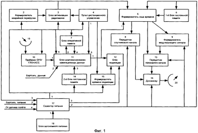 Кроме того, второй вход блока комплексирования навигационных данных 11 предназначен для приема навигационный данных из бортовой сети передачи данных воздушного судна, по которой поступают данные от навигационных приборов (не показаны), установленных на борту воздушного судна. Выход второго блока постоянной памяти 14 соединен с третьим входом блока комплексирования навигационных данных 11, выход и вход блока оперативной памяти соединены соответственно с четвертым входом и вторым выходом блока комплексирования навигационных данных 11, второй выход пульта дистанционного управления 4 соединен с пятым входом блока комплексирования навигационных данных 11, первый выход блока комплексирования навигационных данных 11 соединен со вторым входом формирователя кода времени 5, первый выход которого соединен с входом передатчика 8 спутникового канала, второй выход формирователя 5 кода времени соединен со вторым входом передатчика 15 приводного канала, третий выход формирователя 5 кода времени соединен с входом формирователя 9 модулирующего сигнала, второй вход формирователя 5 кода времени соединен с выходом первого блока постоянной памяти 6, при этом силовая бортовая сеть питания воздушного судна соединена со вторым входом селектора питания 17, на четвертый вход которого поступают данные от датчика полета (не показаны).