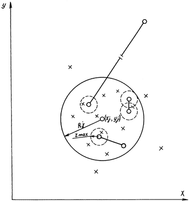 для каждой точки (Xi, Yi) вычисляют ее расстояние Ri=((Xi-Xj)2+(Yi-YJ)2)1/2 от точки (Xj, Yj). Если оно превосходит Rmax, то числа Xi и Yi исключают из рассмотрения и заменяют числами Xj и Yj;